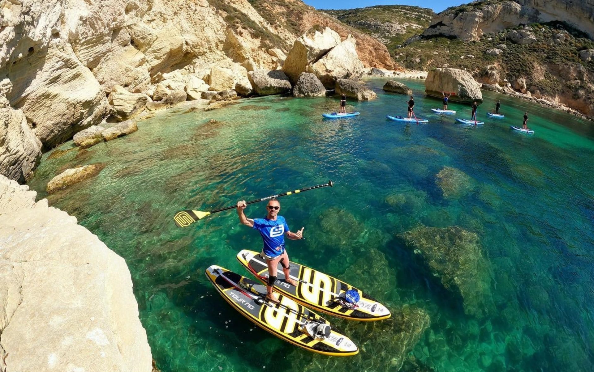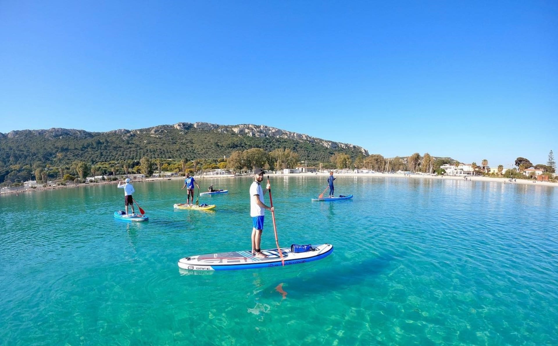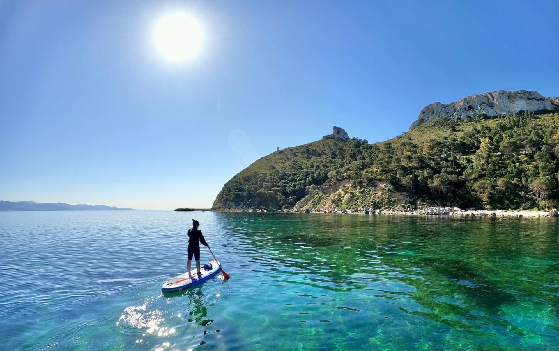 Cagliari aboard a SUP! After discovering how simple and fun it is to slip on the water paddling standing on the SUP, an instructor will teach you the basics and the basic technique. Then you will be ready for the adventure and you will leave for the tour along the cliff of Sella del Diavolo promontory, one of the icons of Cagliari! You will sail slowly on the crystal-clear emerald green waters, among the "faraglioni", close to the limestone cliff in this magical place! Stop in natural pools, where you can snorkel, and a brief stop at a small pebble beach, before leaving for Cala Fighera, passing in front of the imposing entrance to the Grotta dei Colombi. Yet another swim or snorkeling stop, then continue to Calamosca, where you will enter a small cave. Be inspired, convince your friends and explore the wonders of the Sardinian coast!