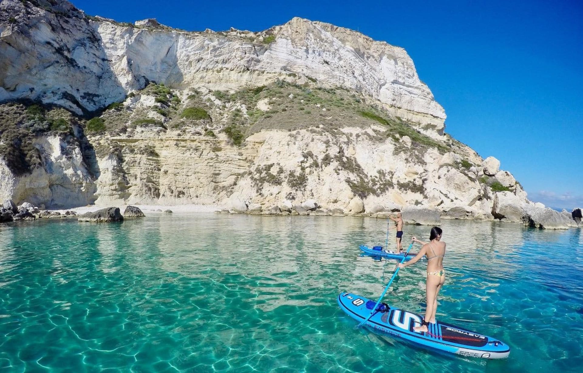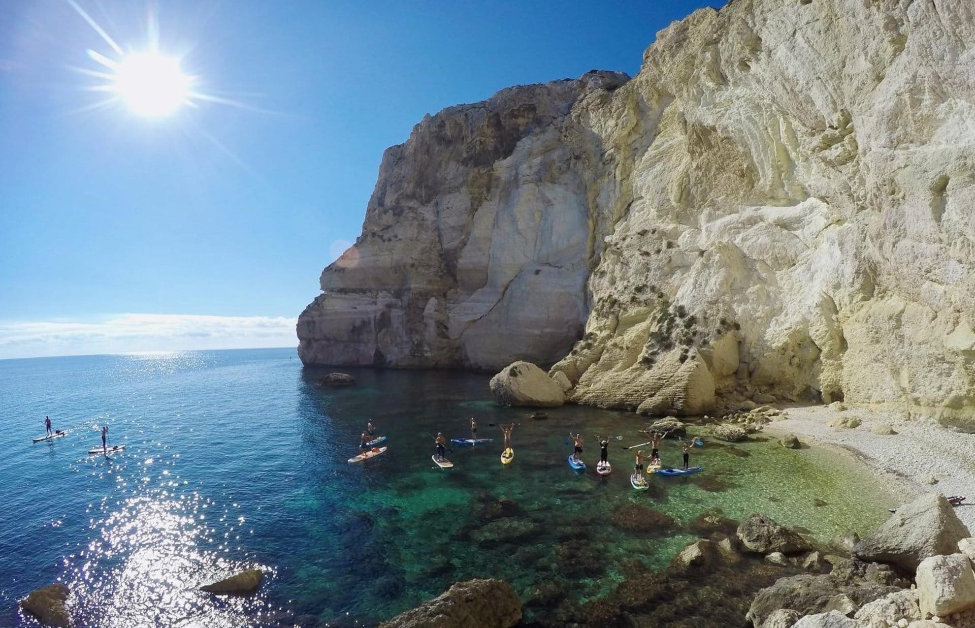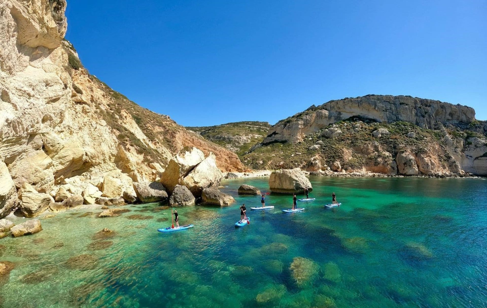Cagliari aboard a SUP! After discovering how simple and fun it is to slip on the water paddling standing on the SUP, an instructor will teach you the basics and the basic technique. Then you will be ready for the adventure and you will leave for the tour along the cliff of Sella del Diavolo promontory, one of the icons of Cagliari! You will sail slowly on the crystal-clear emerald green waters, among the "faraglioni", close to the limestone cliff in this magical place! Stop in natural pools, where you can snorkel, and a brief stop at a small pebble beach, before leaving for Cala Fighera, passing in front of the imposing entrance to the Grotta dei Colombi. Yet another swim or snorkeling stop, then continue to Calamosca, where you will enter a small cave. Be inspired, convince your friends and explore the wonders of the Sardinian coast!