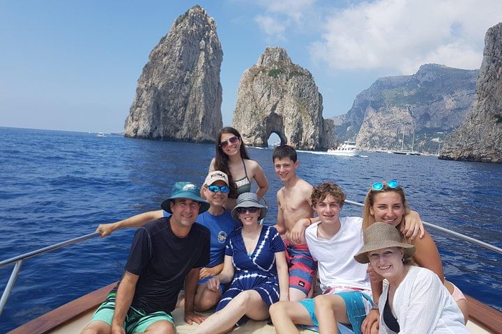 Enjoy boat views of Capri Island, the pearl of the Mediterranean. After free pick up from your accomodation, you will arrive in the port of Marina della Lobra where start the boat tour. We organize everyday this small-group tour with max 12 people on board. 4 hours on board on the sea and 4 hours in Capri for discover the centre. During the tour we will stop more time for swimming and snorkeling, for visit the grotto around the Island and to across the Faraglioni rocks, the symbol of the Island. On the land you have the time for visit in relax the historic and little centre of Capri and Anacapri. The price is all inclusive, drinks, snack, tax, gasoline, skipper guide, pick-up from/to hotel.
