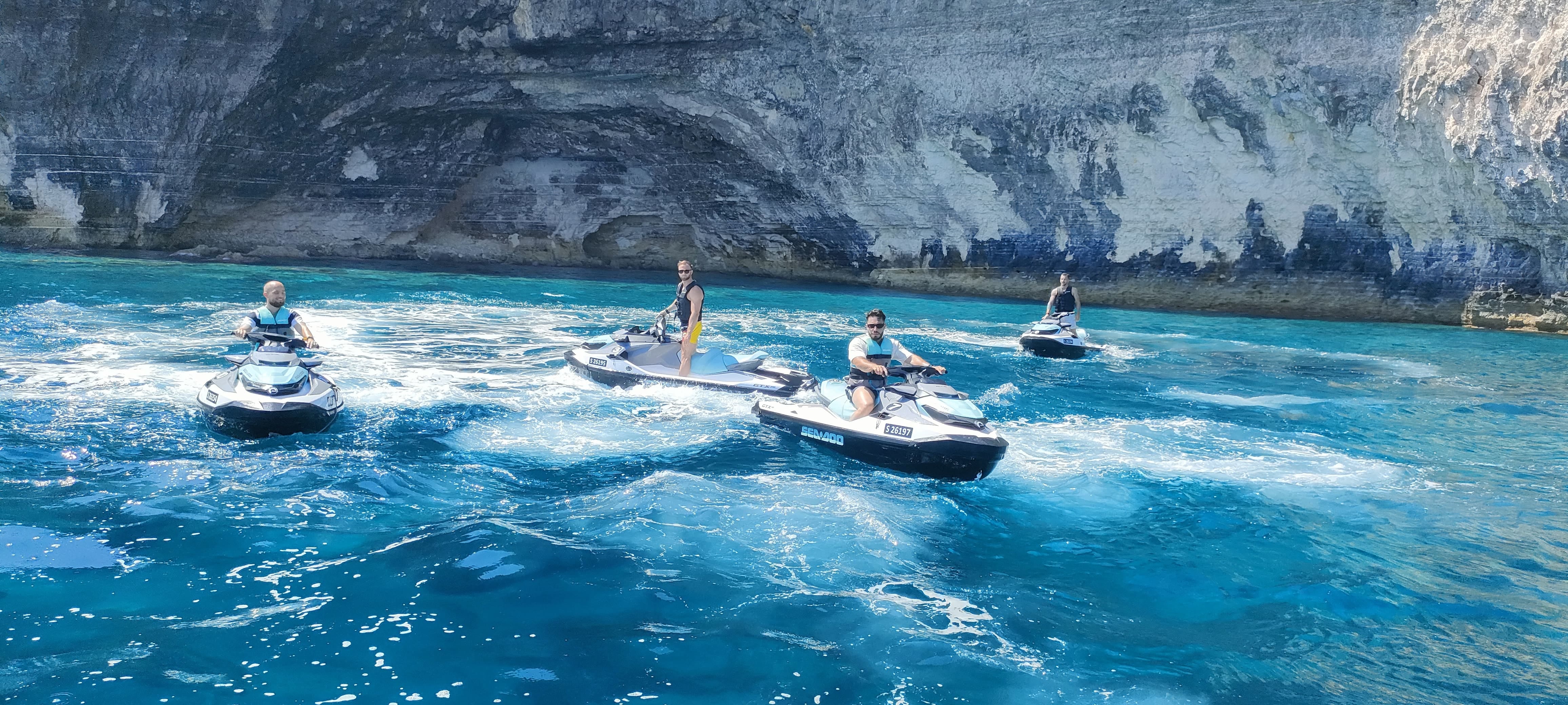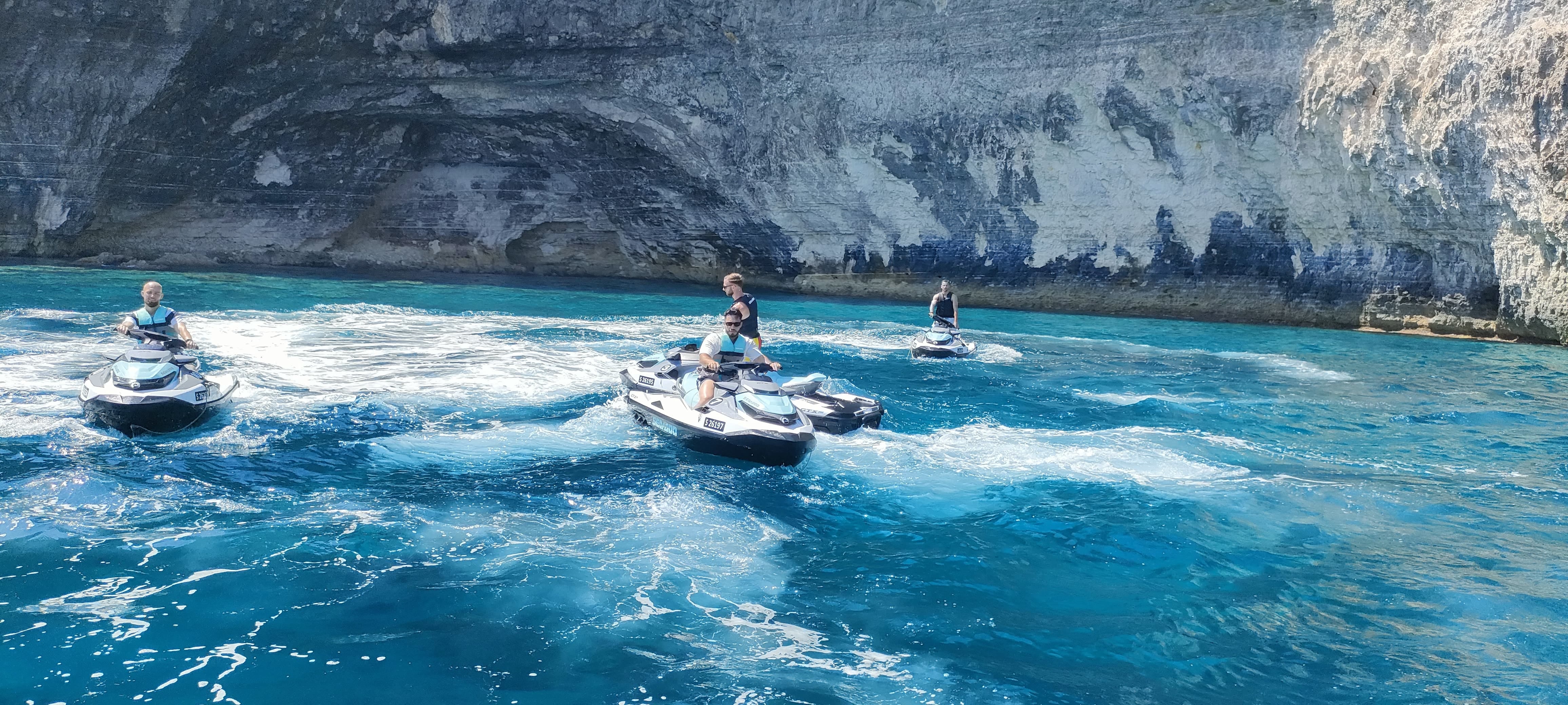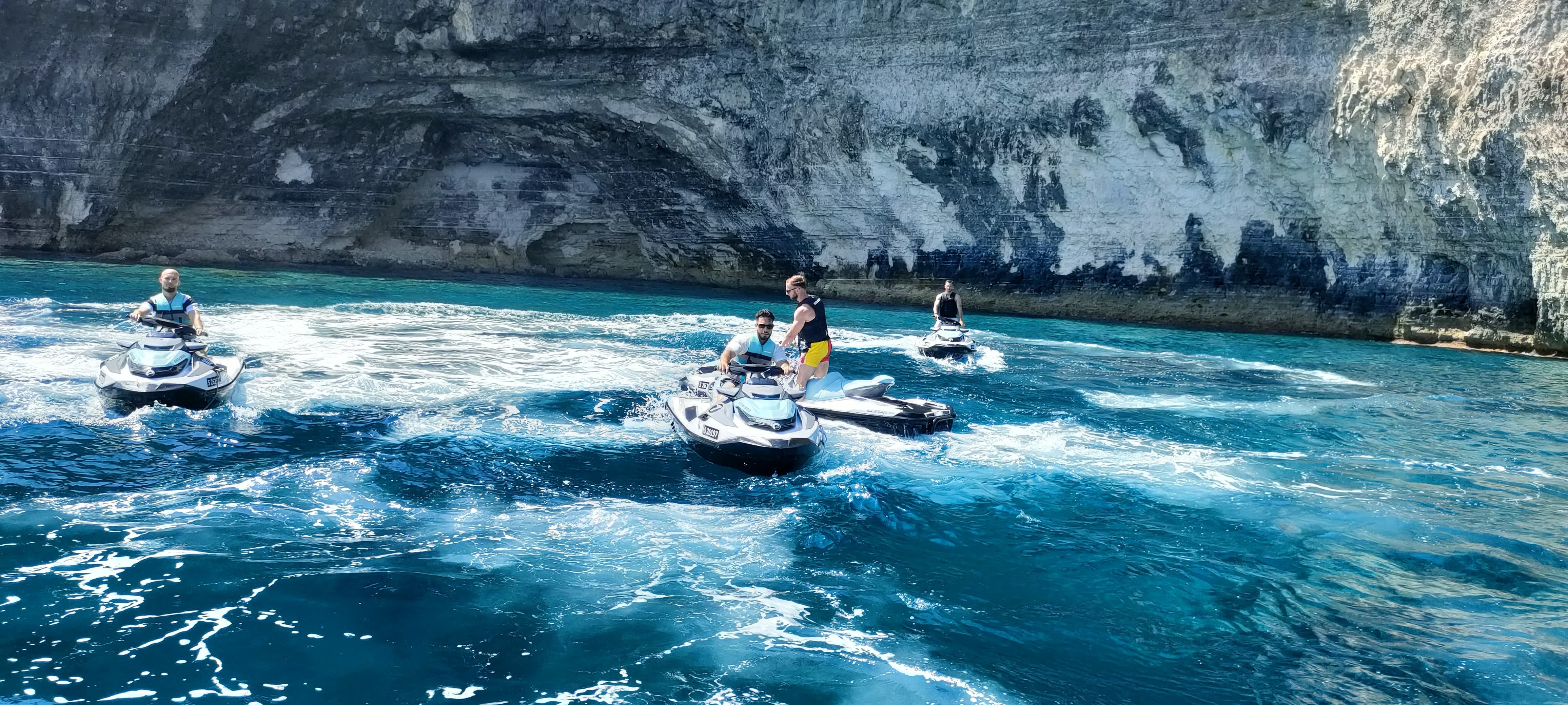 • The departure is from the jetty located behind the Verdi St. George's Bay Marina Hotel (formerly known as Marina Hotel Corinthia Beach Resort) at 8, Ix-Xatt Ta' San Ġorġ, St. Julian’s. When you arrive at this location, near the entrance to the hotel’s underground parking lot, there is a black iron gate. Go through the gate, down the ramp, turn left, and follow the yellow line painted on the ground until you arrive at the jetty where boats and jet skis are parked.