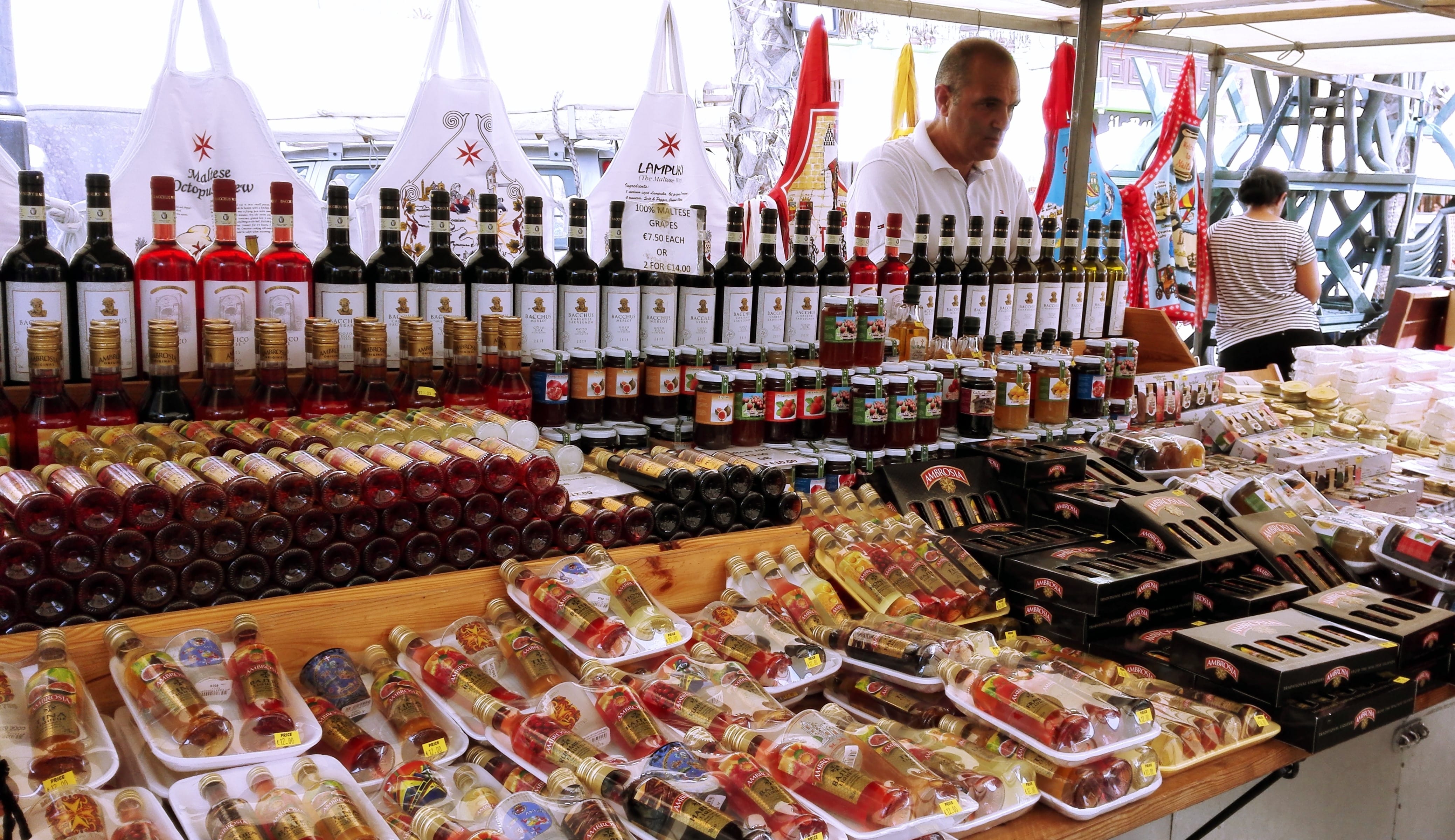 Marsaxlokk is also popular for its many delightful restaurants and nice cafés huddled along its entire promenade and for its charming and large open-air market, which sells a vast assortment of food and a wide array of durable goods, such as fish, locally produced honey and fruit jams, traditional sweets and other delicacies, local wines and liquors, souvenirs, clothes, shoes, traditional lacework and crafts, custom jewellery, accessories, and many more.