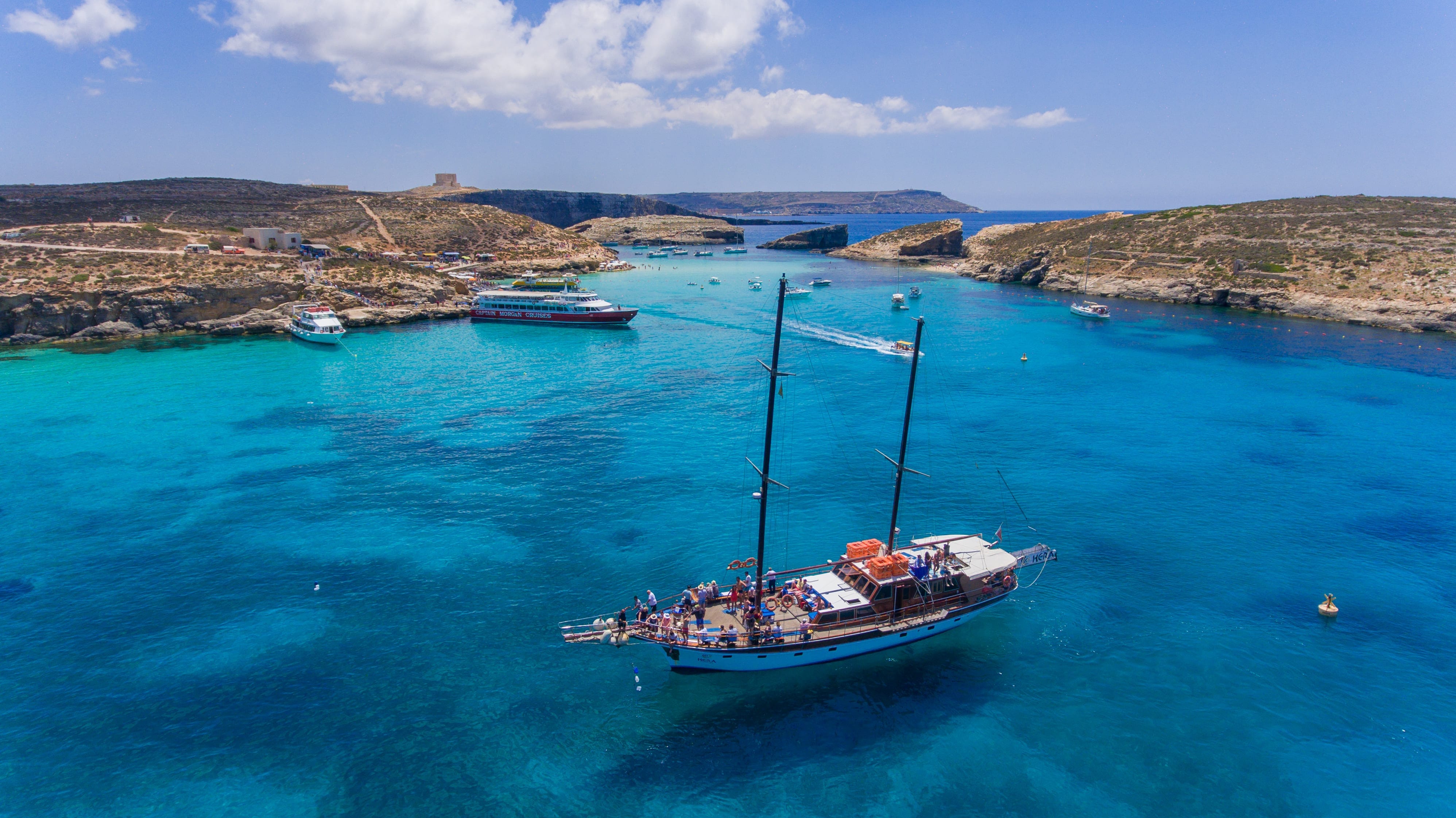 Our last and longest stop will be at Comino Island. Get ready to be amazed by the turquoise, crystal-clear waters of the famous Blue Lagoon! This picturesque bay with transparent cyan waters, a white sandy base, and rich marine life is the perfect spot for a relaxing and unforgettable day. Spend the rest of the day soaking up the sun, swimming, snorkelling, relaxing on the boat, or simply enjoying a walk in the countryside of Comino Island.